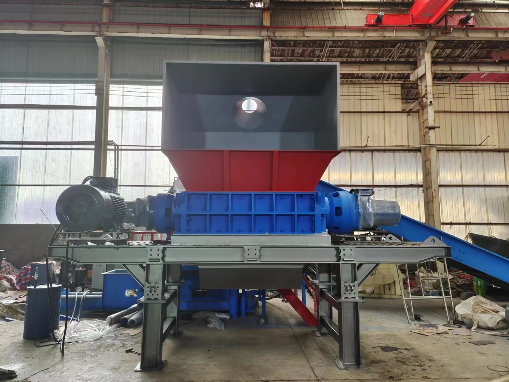 このダブル シェーリング シェラダー に は スクリーン ユニット が あり ませ ん.材料 が トッパー に 入っ た 後,材料 は 2 つの 対 回転 刃 を 用い て 処理 さ れ,直 に 放出 さ れ ます.