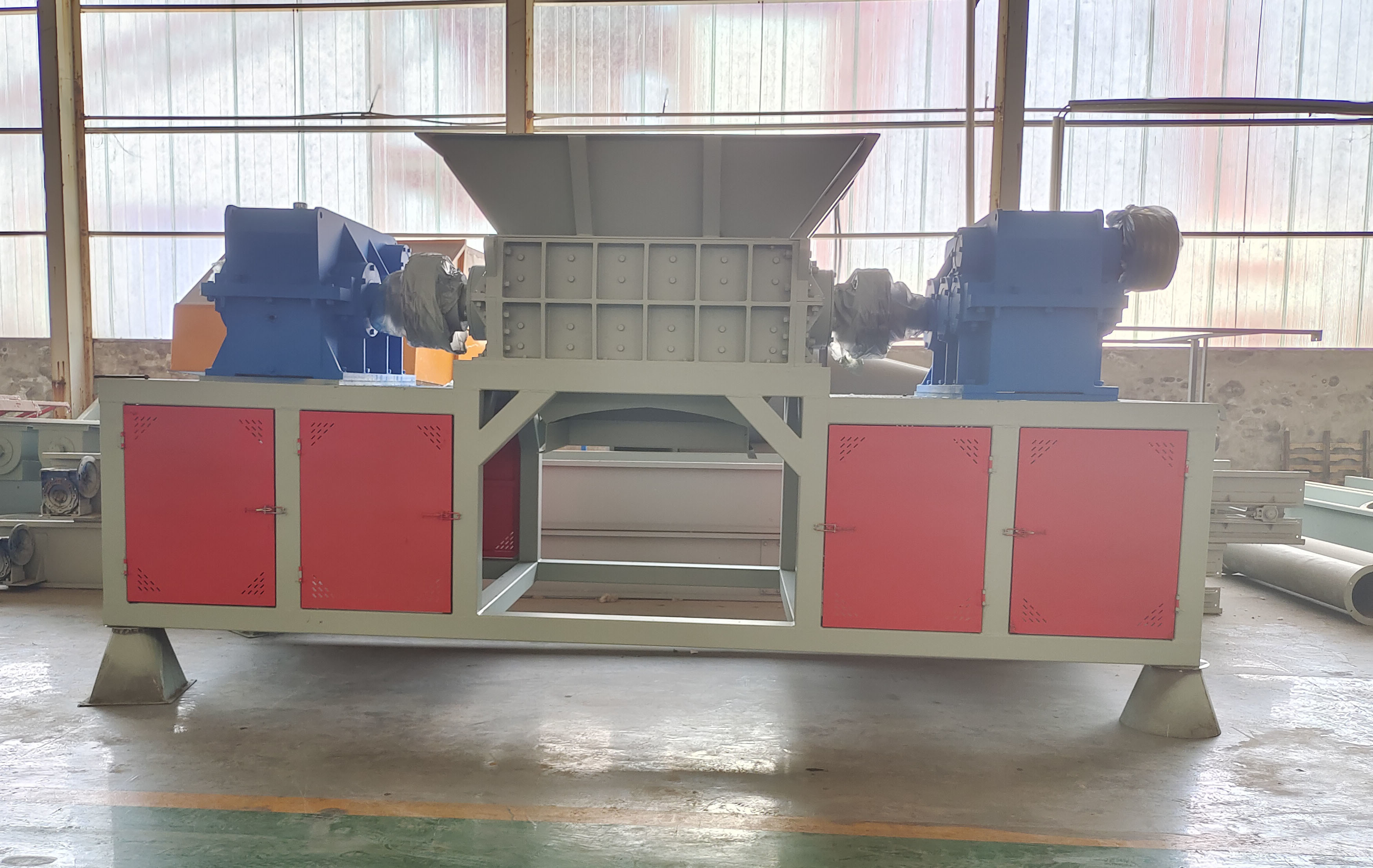 このダブル シェーリング シェラダー に は スクリーン ユニット が あり ませ ん.材料 が トッパー に 入っ た 後,材料 は 2 つの 対 回転 刃 を 用い て 処理 さ れ,直 に 放出 さ れ ます.