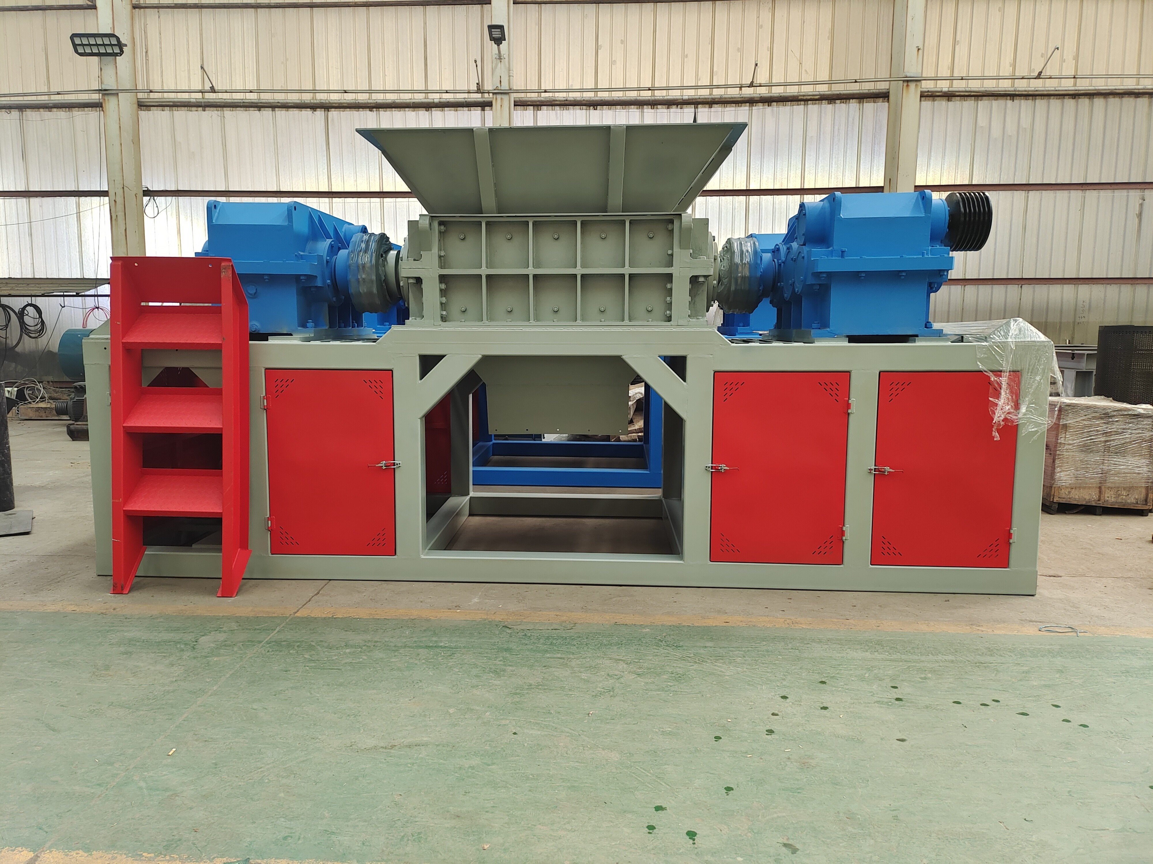 このダブル シェーリング シェラダー に は スクリーン ユニット が あり ませ ん.材料 が トッパー に 入っ た 後,材料 は 2 つの 対 回転 刃 を 用い て 処理 さ れ,直 に 放出 さ れ ます.